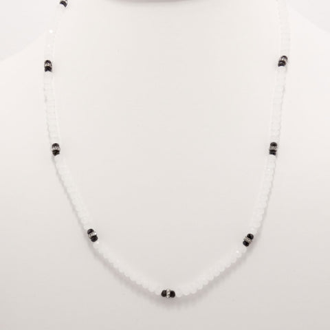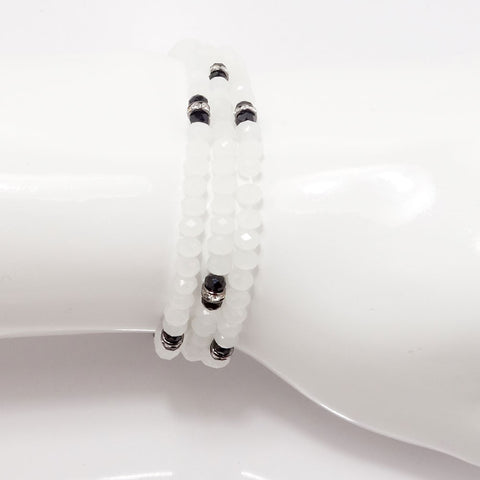 Our 4mm frosted white crystal three wrap beaded bracelet consist of beautiful crystals adorned by black rhinestone spacers. Created on elastic cording allows you to wear this piece as a triple wrap bracelet or a stylish short necklace.